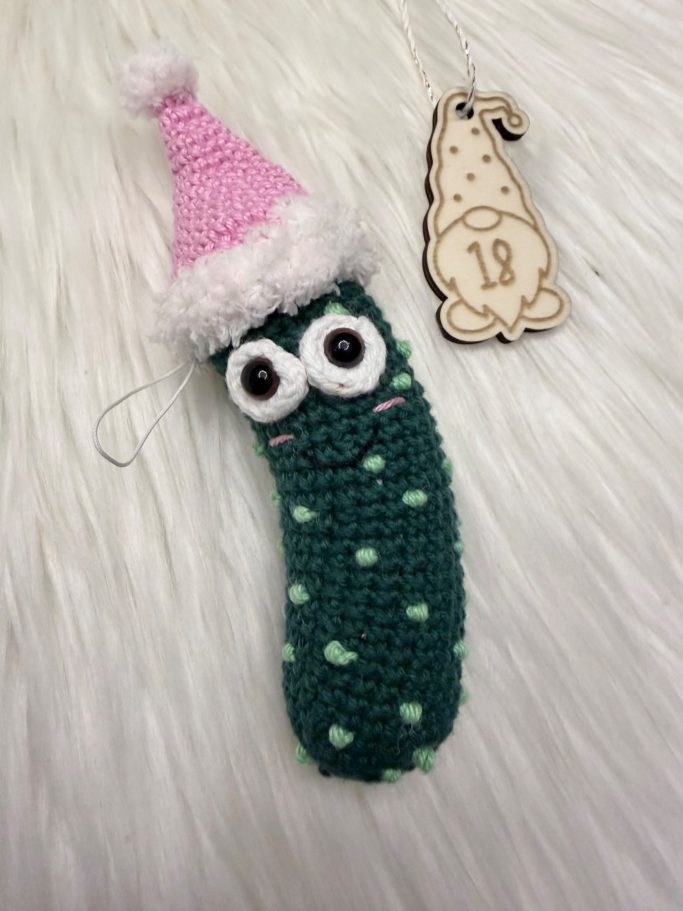 In der Stadtverwaltungsedition war eine Marmelade und im gemischten Kalender eine gehäkelte Spreewaldgurke mit Weihnachtsmütze. Die Gurke kann man als Anhänger nutzen und die Mütze abmachen, dann hat die Gurke eine kleine Krone auf und ist auch außerhalb von Weihnachten nutzbar.