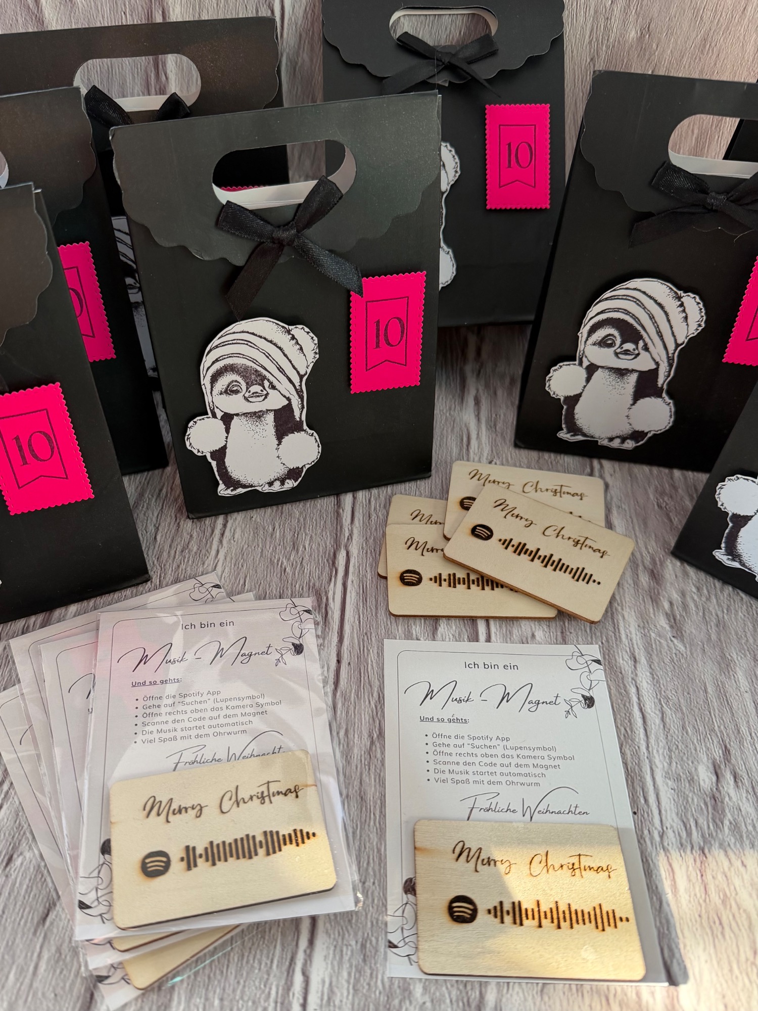 Heute war mein Beitrag dran. In beiden Kalendern befand sich jeweils ein gelaserter Musik-Magnet mit Anleitung. Entweder hatte man "All I want for Christmas" oder "Last Christmas". Auf dem zweiten Bild sieht man die Magneten mit Verpackung als ich sie damals fertiggestellt hatte.