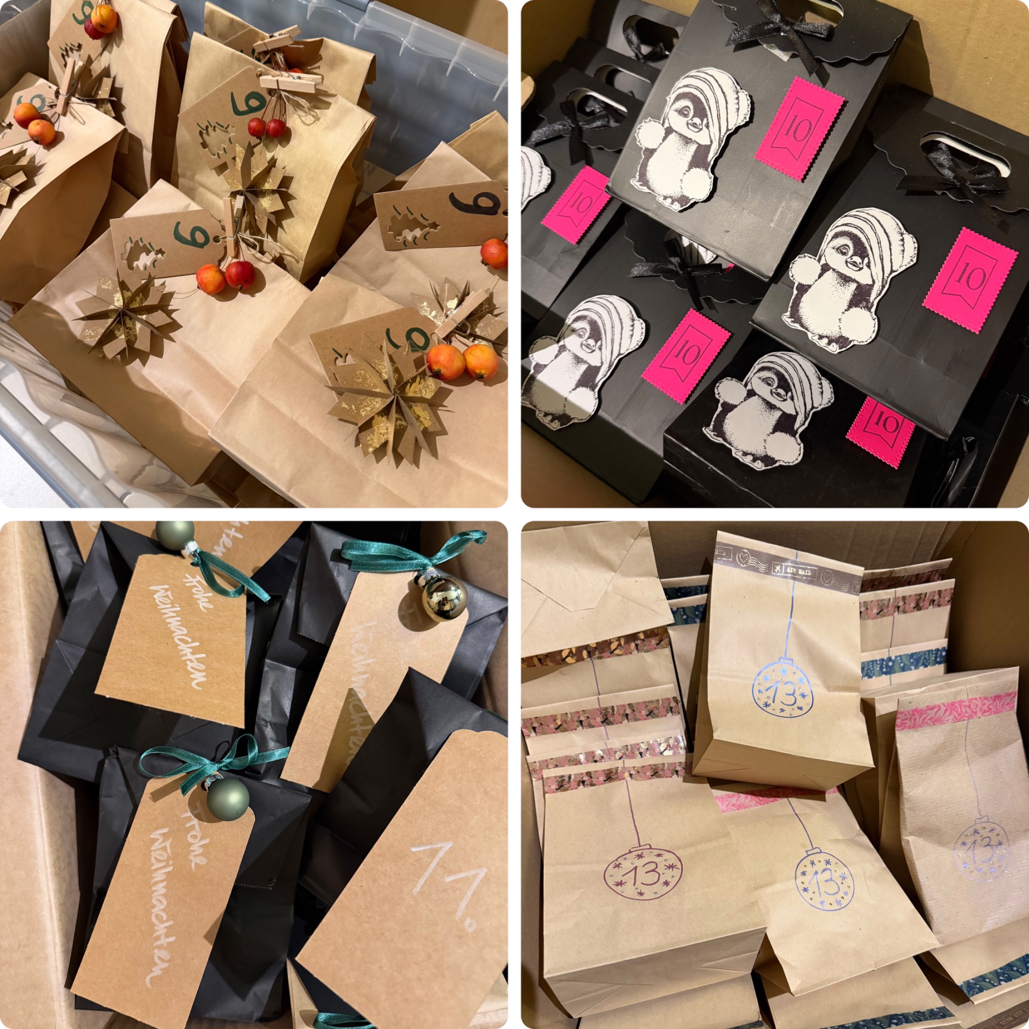Auch hier haben alle pünktlioch abgliefert. Die Teilnehmer sind ganz bunt gemischt. Anders als beim anderen Kalender, in dem 100% Stadtverwaltungsbeschäftigte sind. Hier sind kreative Kleinunternehmerinnen, Freunde, Freunde von Freunden, Bekannte aber auch ein paar aus der Stadtverwaltung sowie ehemalige Mitarbeiter. Und auch habe ich eine Teilnehmerin dabei, der ich seit langem auf Instagram folge, sie aber gar nicht persönlioch kenne. Also so verschieden wie die Verpackungen des Kalenders. Ich kann es kaum abwarten endlich zu öffnen.