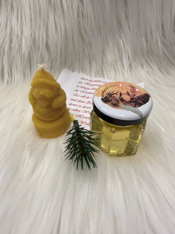 In der Stadtverwaltungsedition gab es einen weihnachtlichen Likör aus Apfel-Zimt. Im gemischten Kalender war ein Gläschen Honig und eine aus Bienenwachs gegossene Kerze.